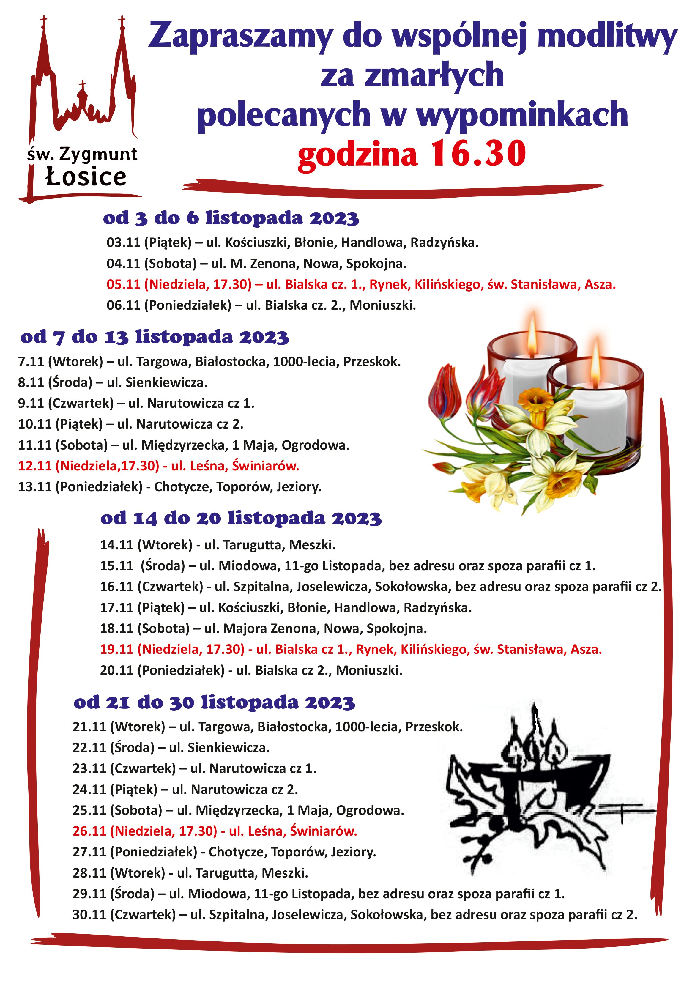 Porządek Modlitwy Wypominkowej w listopadzie. Zapraszamy mieszkańców miejscowości i ulic do wspólnej modlitwy za zmarłych o godz. 16.30 (niedziela 17.30)