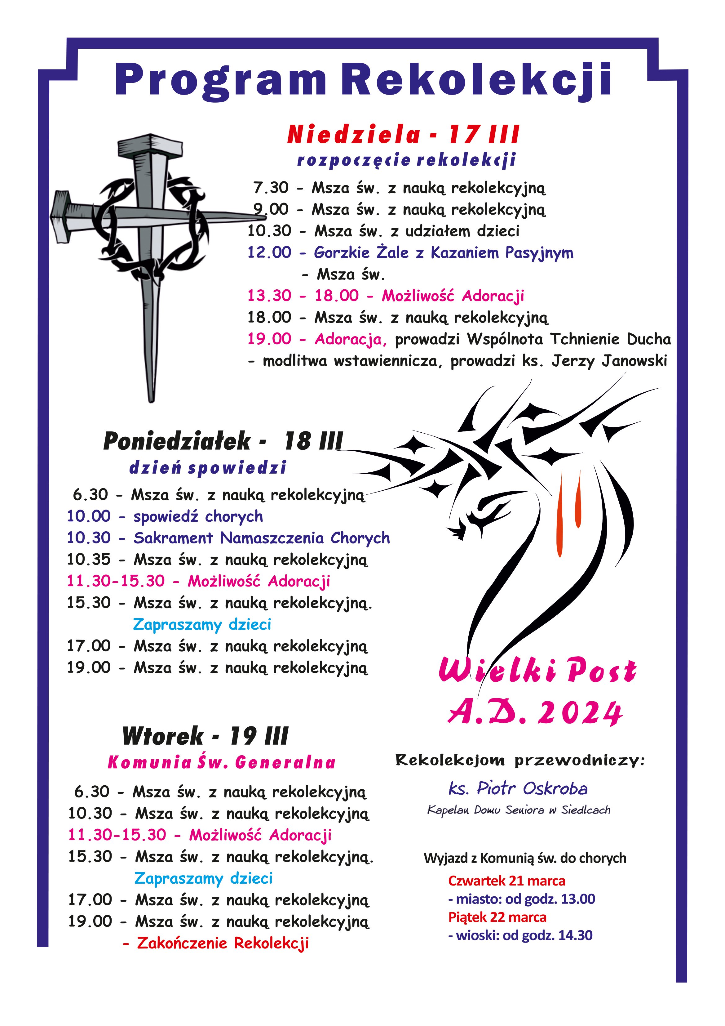 W dni powszednie:Spowiedź tylko przed Mszą św.od 6.00 do 6.25 i od 17.30 do 17.55Nie ma spowiedzi w czasie Mszy św.